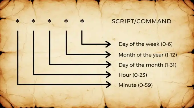 A standard cron entry consists of five time fields followed by the command to execute: