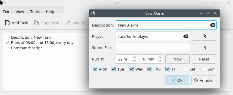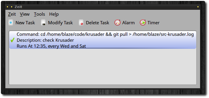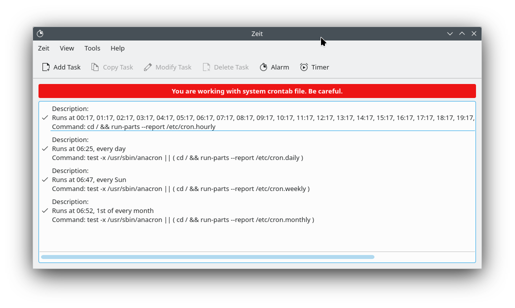 zeit is a Qt Gui to cron and its goal is to make creating cronjobs very easy.