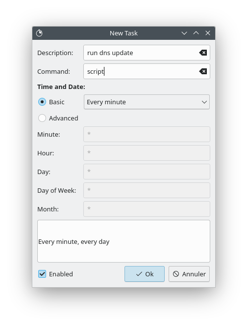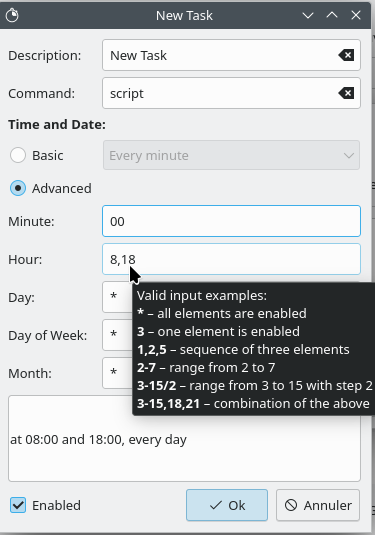 In the “Time and Date” section, we can select Basic to quickly schedule a task. The Advanced option allows to schedule more precise tasks, with minute, hour, day of the week, month. We can input more than one number, for example "8,18" will run the task at 8am and 6pm. Hovering the mouse above any of the fields will show a pop-up with list of crontab syntax.
