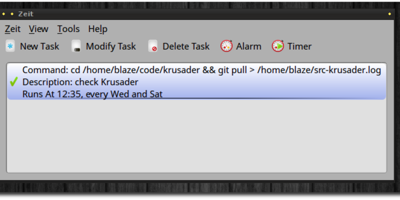 zeit is a Qt Gui to cron and its goal is to make creating cronjobs very easy.